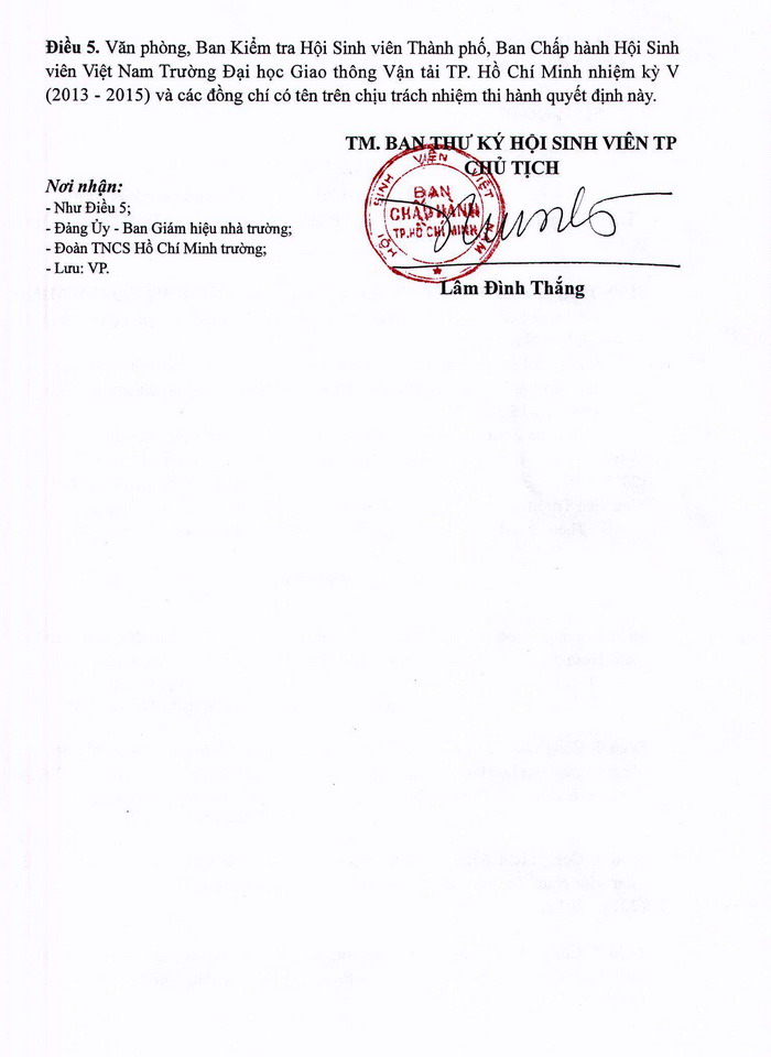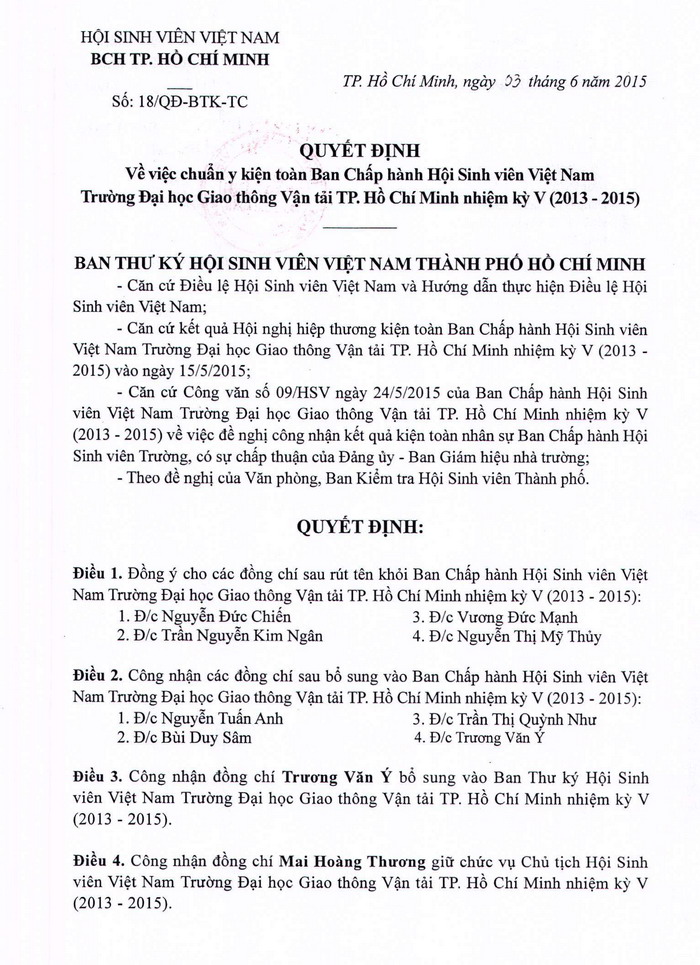 Quyết định chuẩn y kiện toàn BCH Hội sinh viên Việt Nam Trường ĐH Giao thông vận tải TP.HCM nhiệm kỳ V (2013-2015) (Cập nhật ngày: 12/06/2015)
