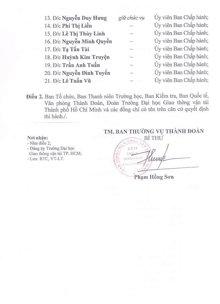 Quyết định công nhận BCH Đoàn TNCS Hồ Chí Minh Trường ĐH GTVT TP. HCM nhiệm kỳ XI (2017-2019) (Cập nhật ngày: 11/09/2017)