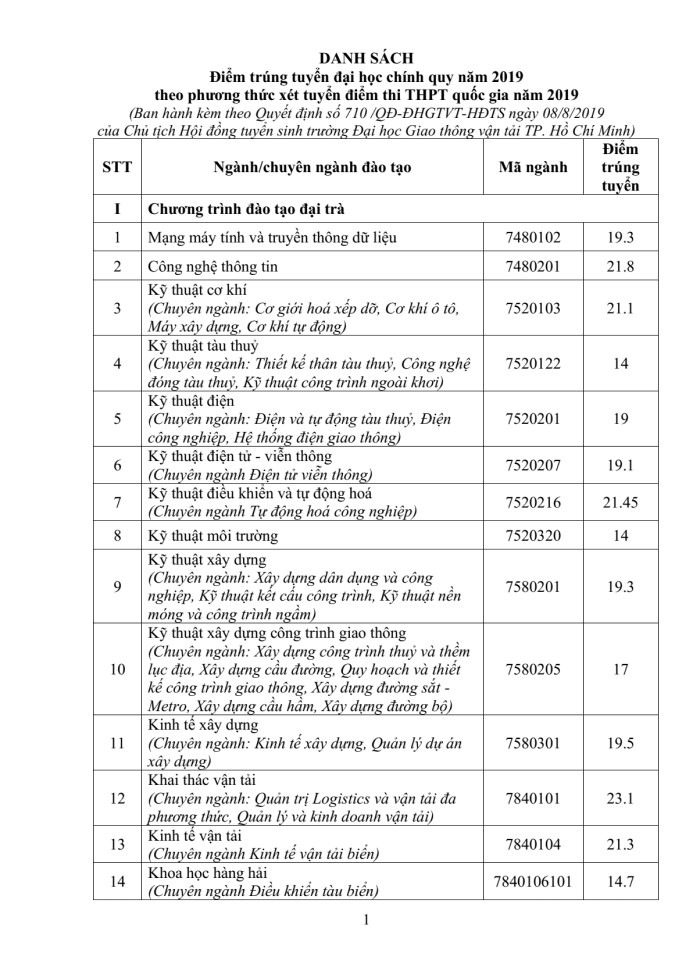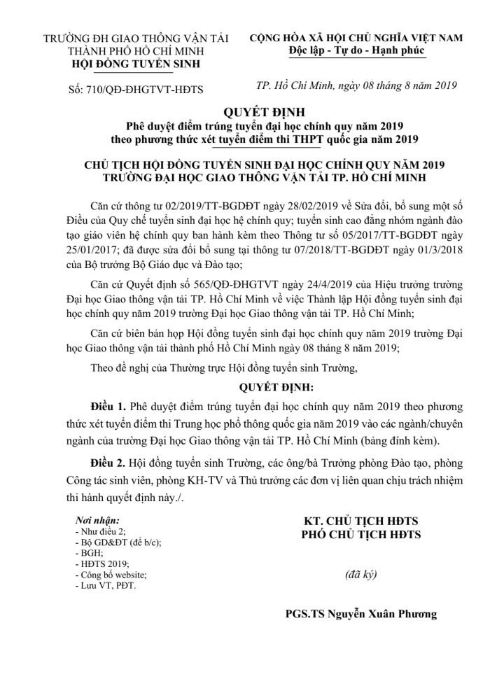Quyết định điểm trúng tuyển đại học chính quy năm 2019 theo phương thức xét tuyển điểm thi THPT Quốc gia năm 2019 (Cập nhật ngày: 08/08/2019)