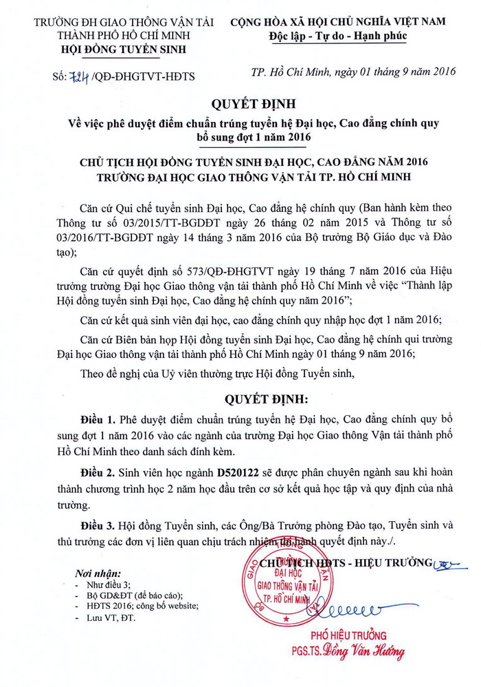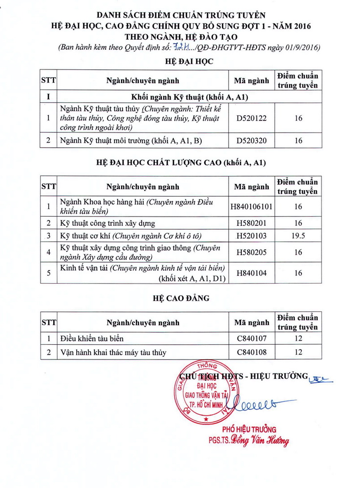 Quyết định phê duyệt điểm chuẩn trúng tuyển hệ ĐH-CĐ chính quy bổ sung đợt 1 năm 2016 (Cập nhật ngày: 01/09/2016)