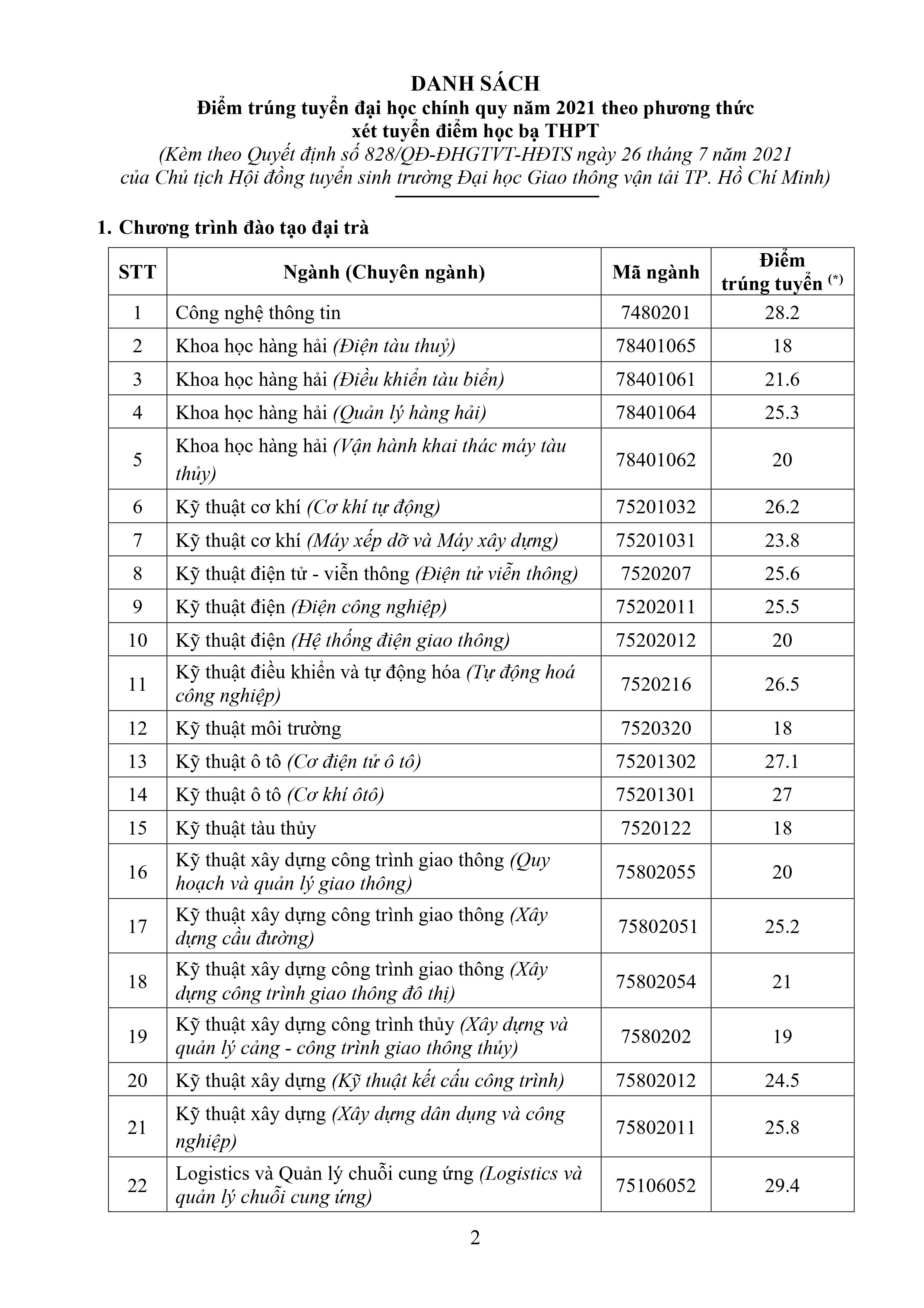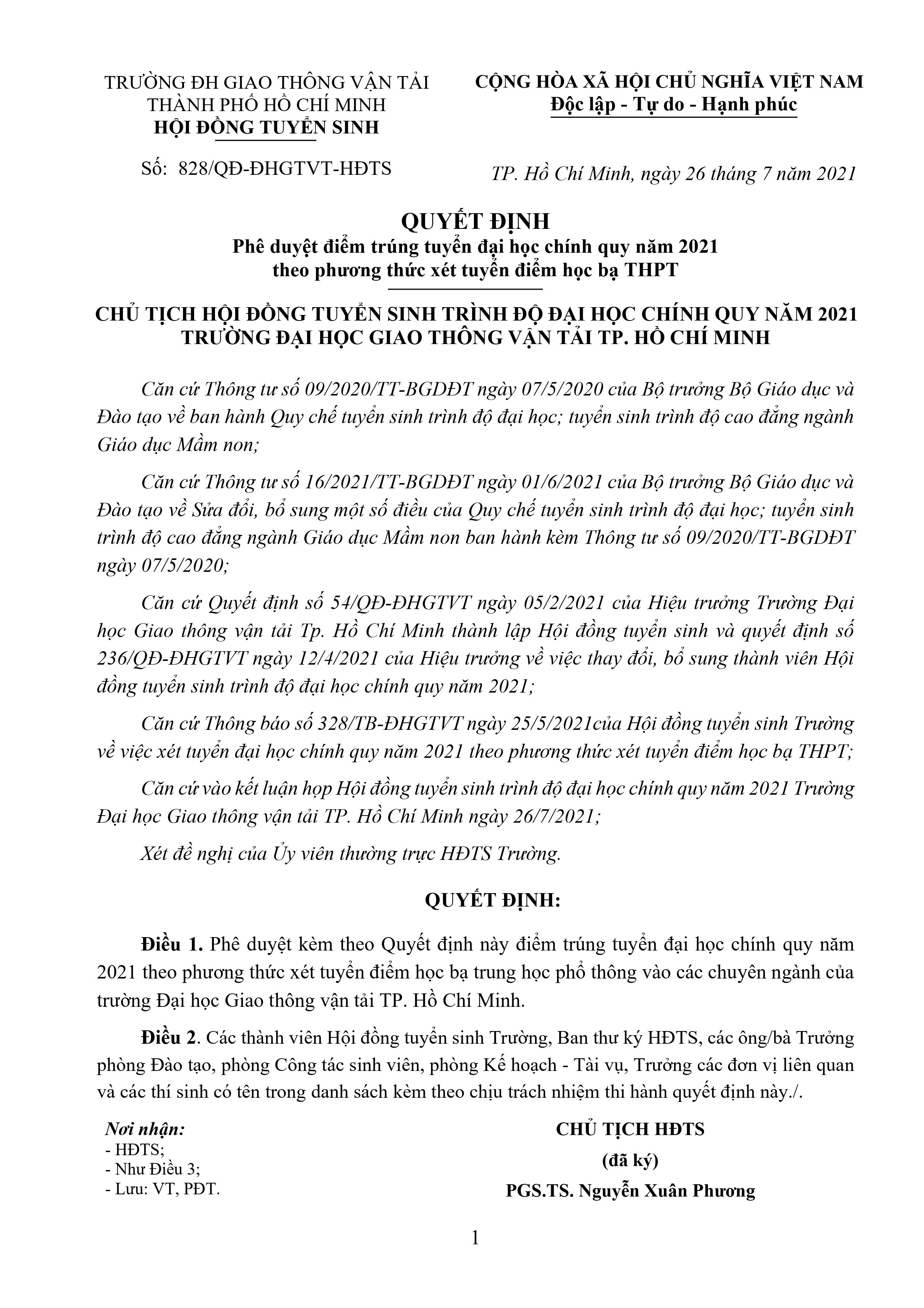 Quyết định phê duyệt điểm trúng tuyển đại học chính quy năm 2021 theo phương thức xét tuyển điểm học bạ THPT (Cập nhật ngày: 26/07/2021)