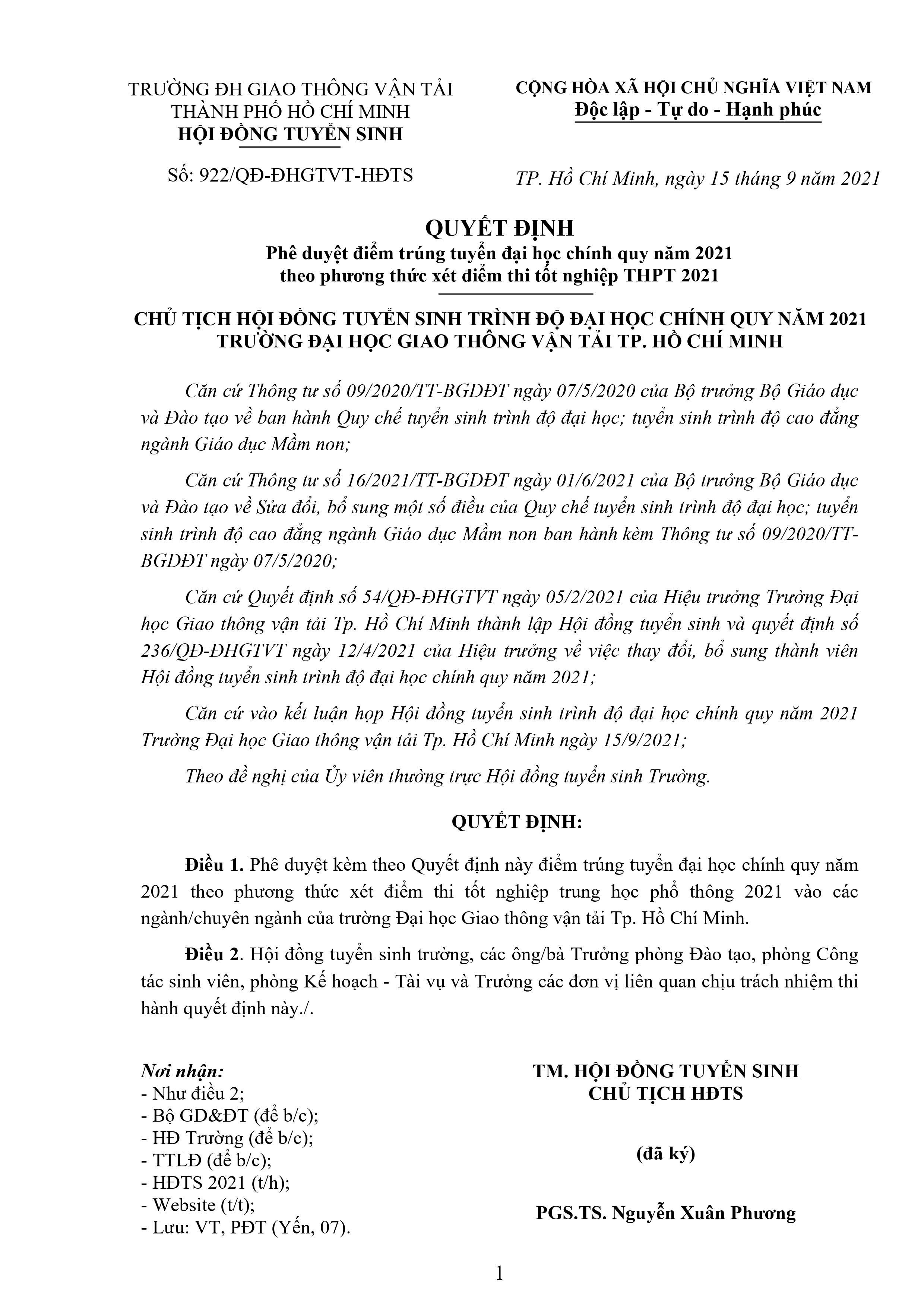 Quyết định phê duyệt điểm trúng tuyển đại học chính quy năm 2021 theo phương thức xét tuyển thi tốt nghiệp THPT 2021 (Cập nhật ngày: 16/09/2021)