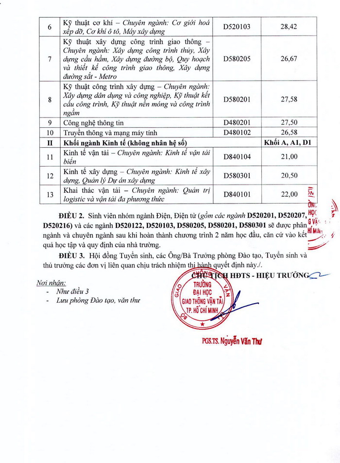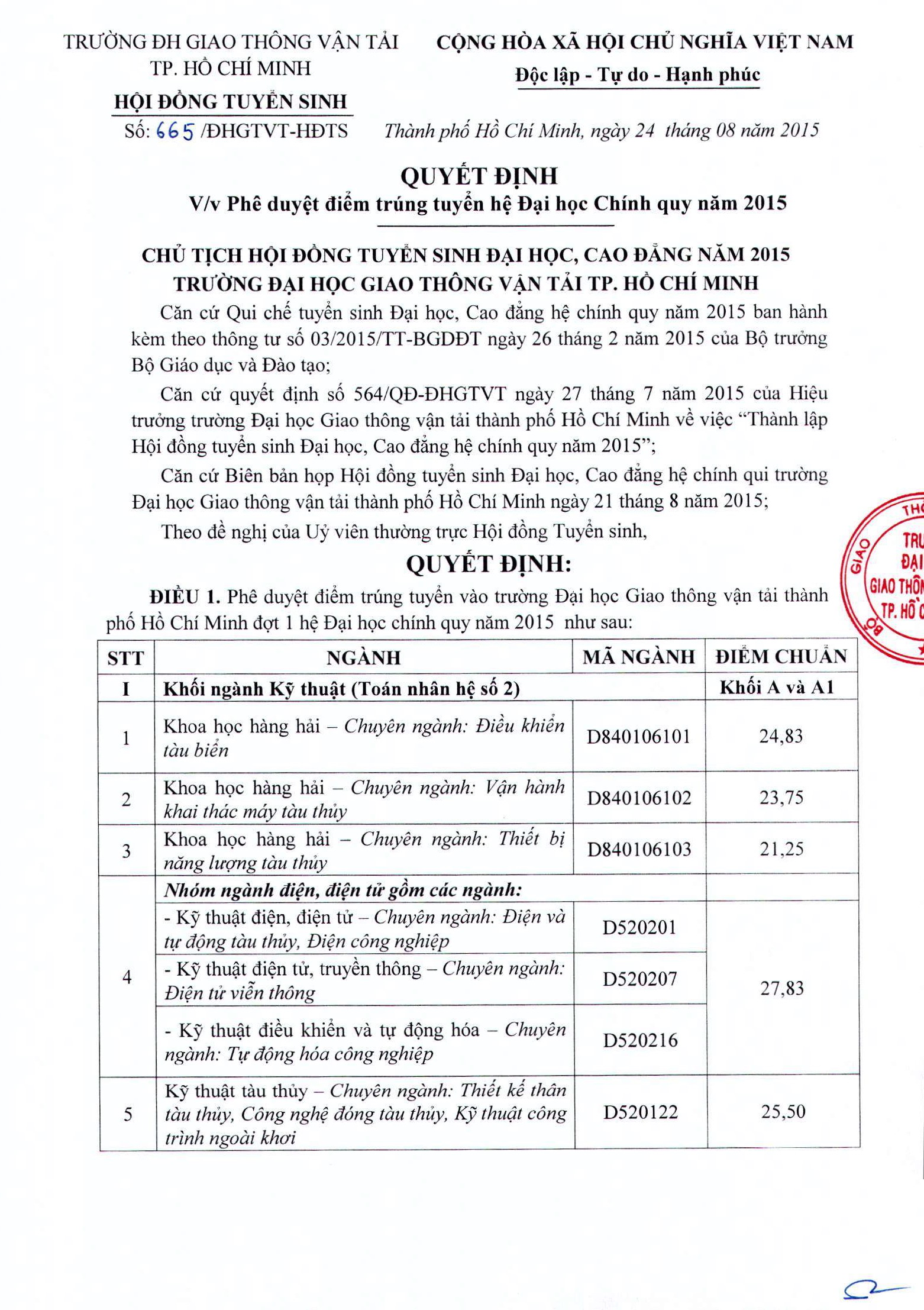 Quyết định phê duyệt điểm trúng tuyển hệ Đại học chính quy năm 2015 Trường ĐH Giao thông vận tải TP.HCM (Cập nhật ngày: 24/08/2015)