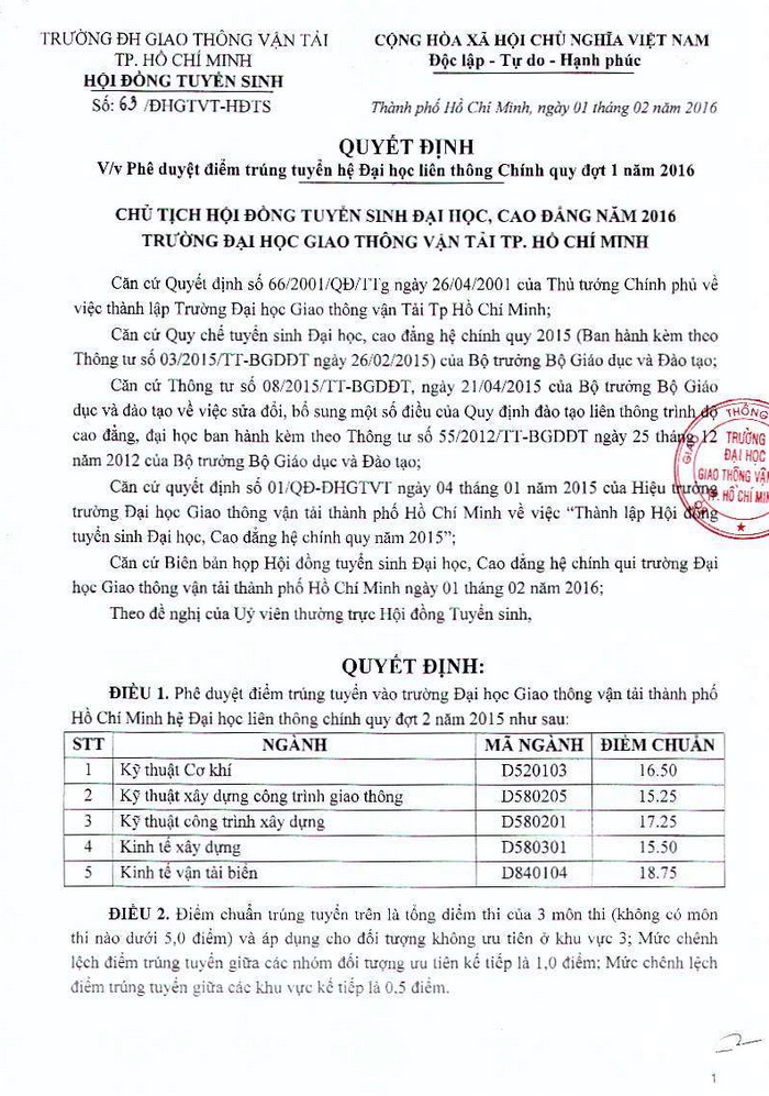 Quyết định phê duyệt điểm trúng tuyển hệ Đại học liên thông chính quy đợt 1 năm 2016 (Cập nhật ngày: 01/02/2016)