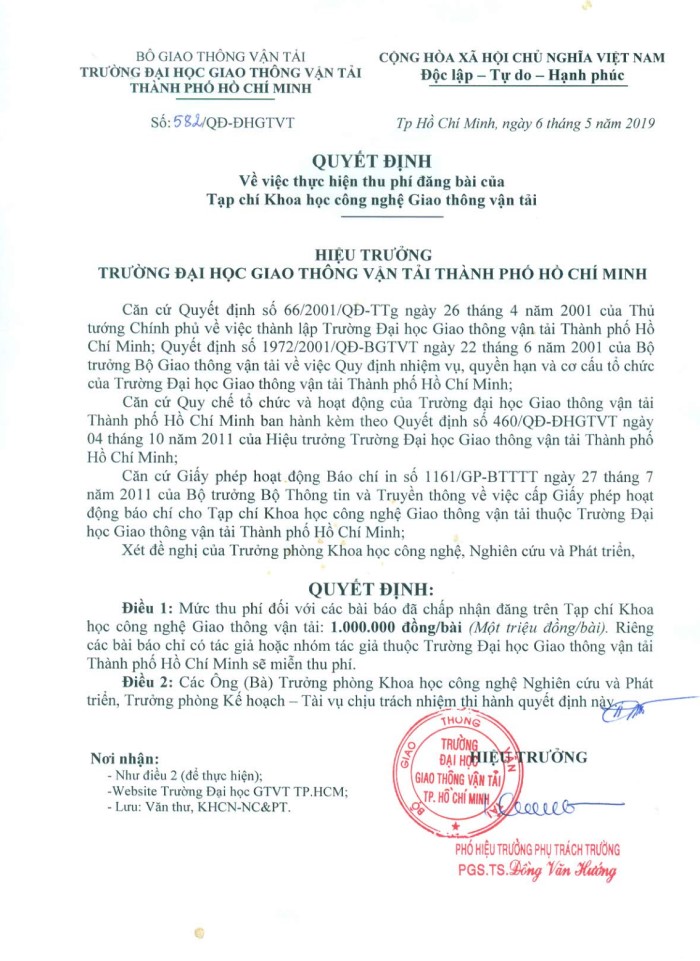 Quyết định thực hiện thu phí đăng bài của Tạp chí Khoa học công nghệ Giao thông vận tải (Cập nhật ngày: 10/05/2019)