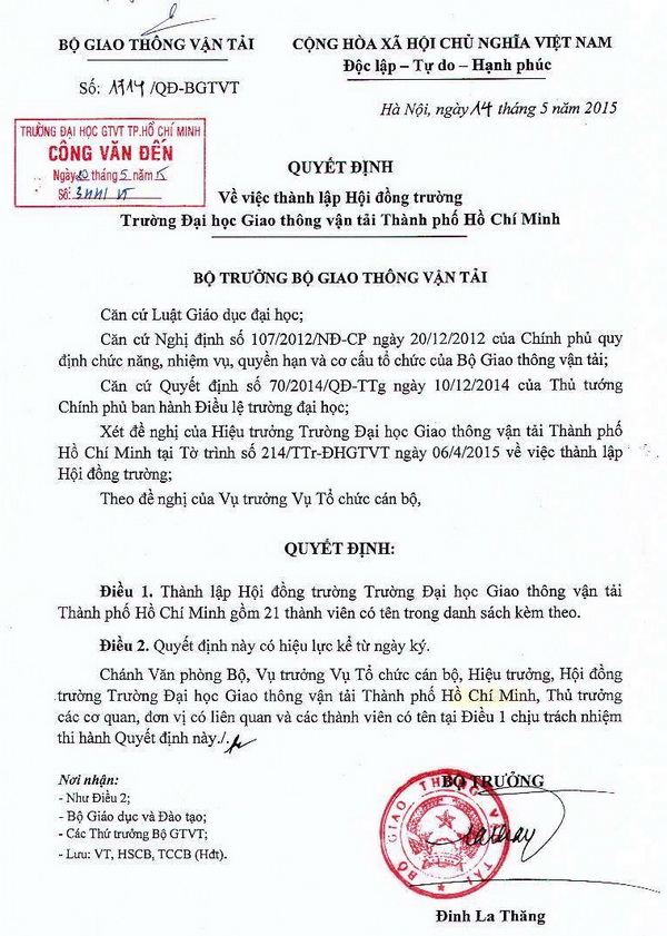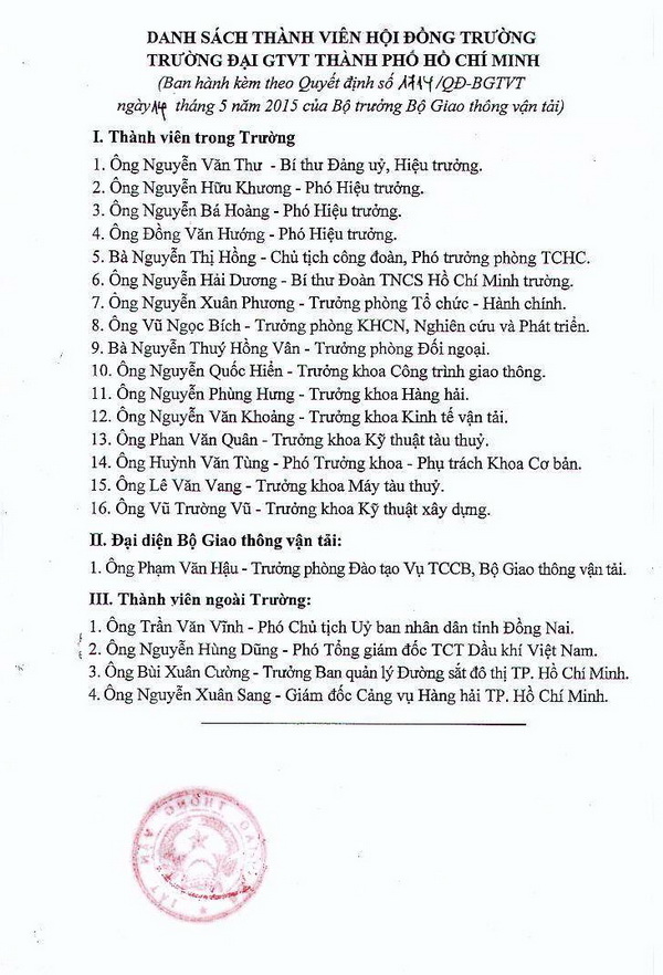 Quyết định Về việc thành lập Hội đồng trường Trường Đại học Giao thông vận tải Thành phố Hồ Chí Minh (Cập nhật ngày: 20/05/2015) >> Quy chế tổ chức và hoạt động của Hội đồng Trường, Trường ĐH Giao thông vận tải TP. HCM nhiệm kỳ 2015-2020