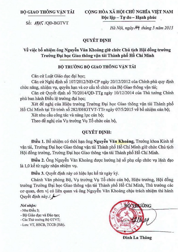 Quyết định V/v bổ nhiệm ông Nguyễn Văn Khoảng giữ chức Chủ tịch Hội đồng trường Trường Đại học Giao thông vận tải Thành phố Hồ Chí Minh (Cập nhật ngày: 20/05/2015)