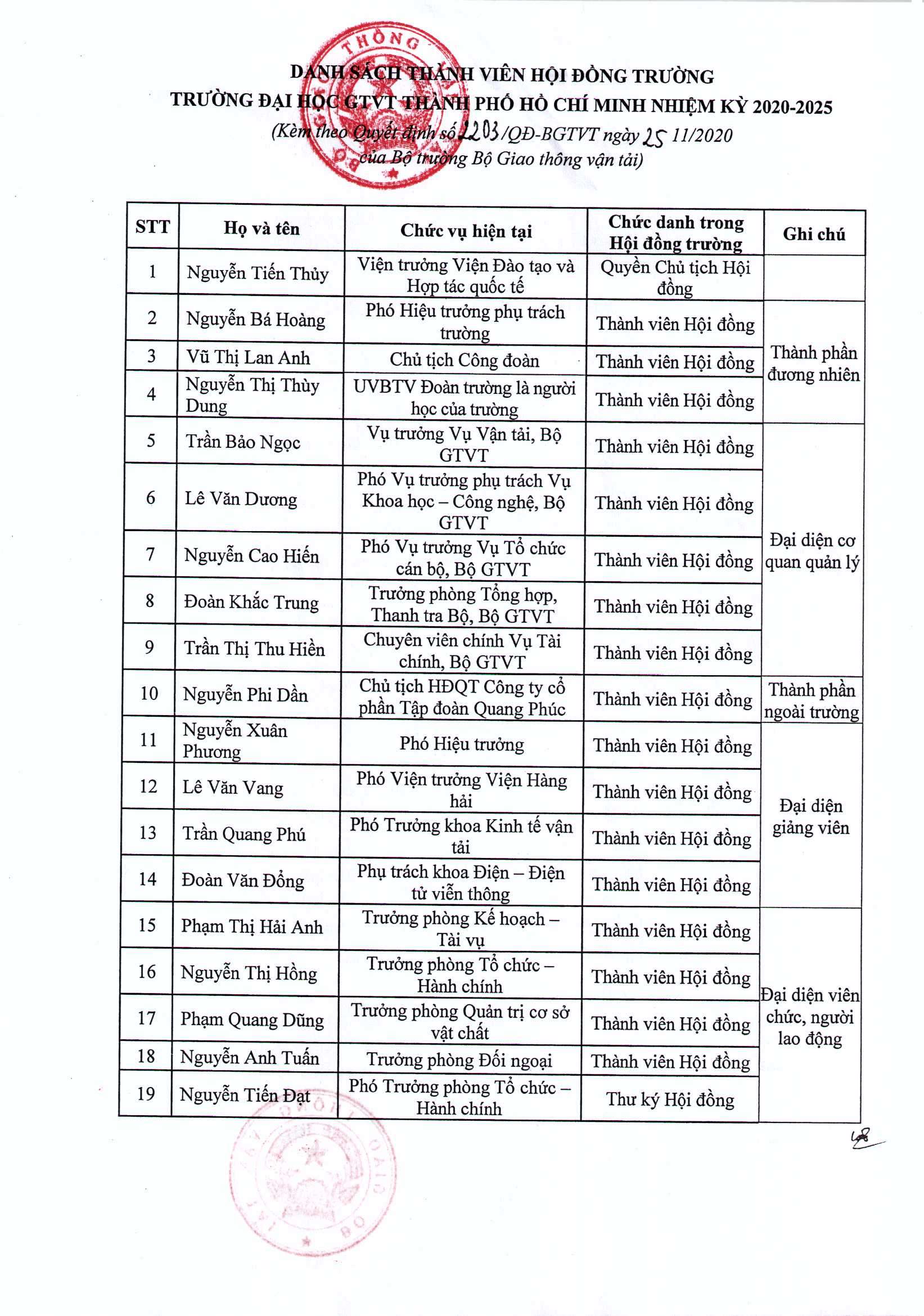 Quyết định V/v công nhận Hội đồng trường Trường ĐH Giao thông vận tải TP.Hồ Chí Minh nhiệm kỳ 2020-2025 (Cập nhật ngày: 04/12/2020) Hội đồng Trường nhiệm kỳ 2020-2025 chụp ảnh cùng Thứ trưởng Bộ GTVT Lê Anh Tuấn