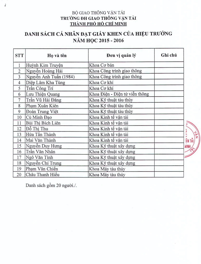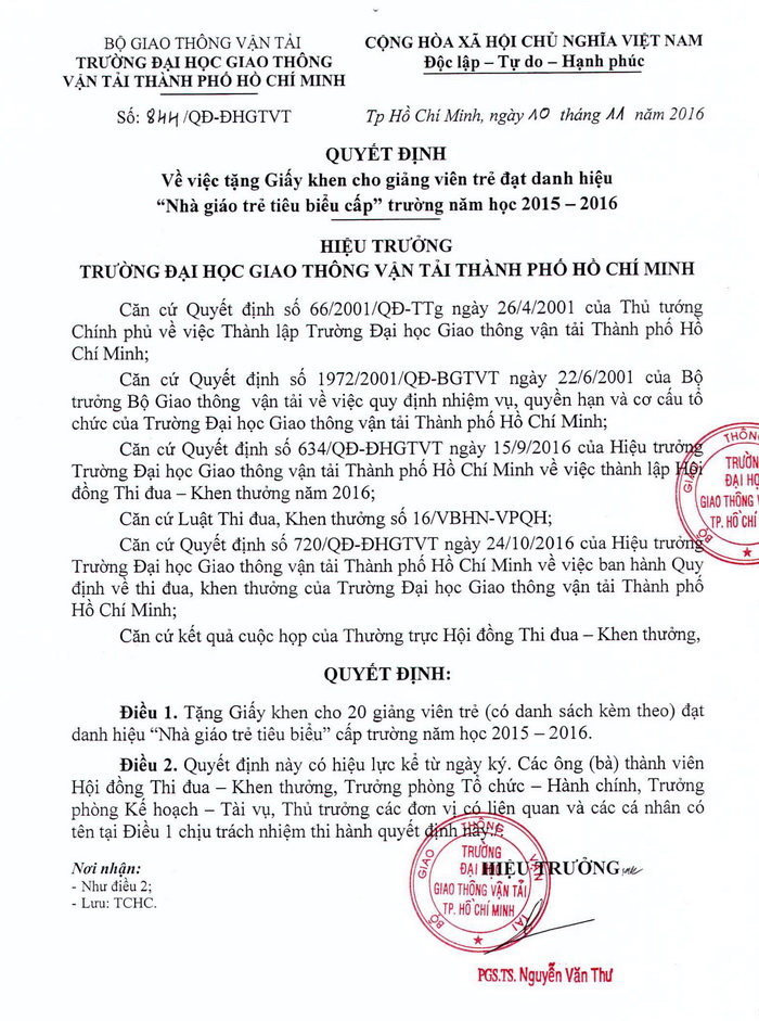 Quyết định V/v tặng giấy khen cho giảng viên đạt danh hiệu "Nhà giáo trẻ tiêu biểu" cấp Trường năm học 2015-2016 (Cập nhật ngày: 15/11/2016)