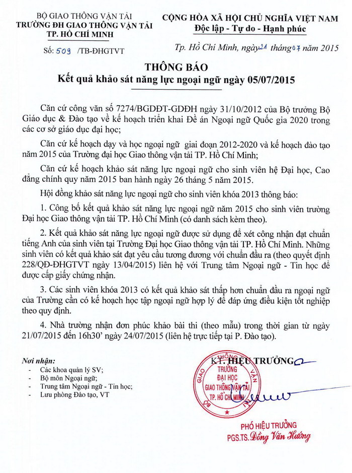 Thông báo kết quả khảo sát năng lực ngoại ngữ ngày 05/7/2015 (Cập nhật ngày: 21/07/2015) >> Kết quả thi khảo sát (phòng thi 1 – 14) >> Kết quả thi khảo sát (phòng thi 15 – 31) >> Kết quả thi khảo sát (phòng thi 32 – 50) >> Mẫu đơn xin phúc khảo