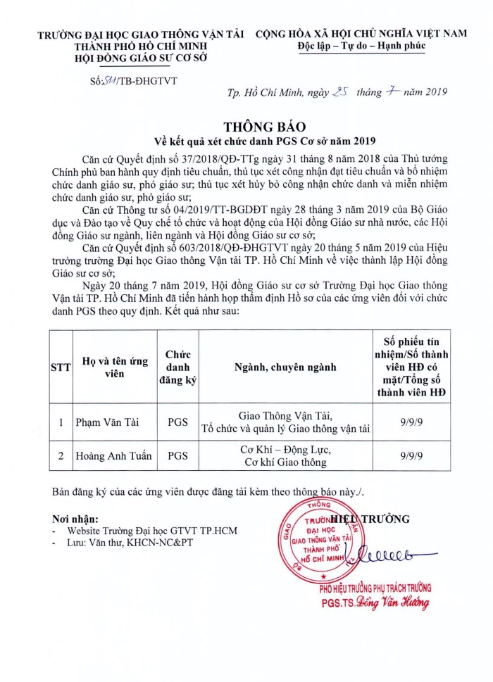 Thông báo kết quả xét chức danh PGS cấp cơ sở (Cập nhật ngày: 25/07/2019) >> Bản đăng ký xét công nhận đạt tiêu chuẩn chức danh PGS của ứng viên Hoàng Anh Tuấn >> Bản đăng ký xét công nhận đạt tiêu chuẩn chức danh PGS của ứng viên Phạm Văn Tài