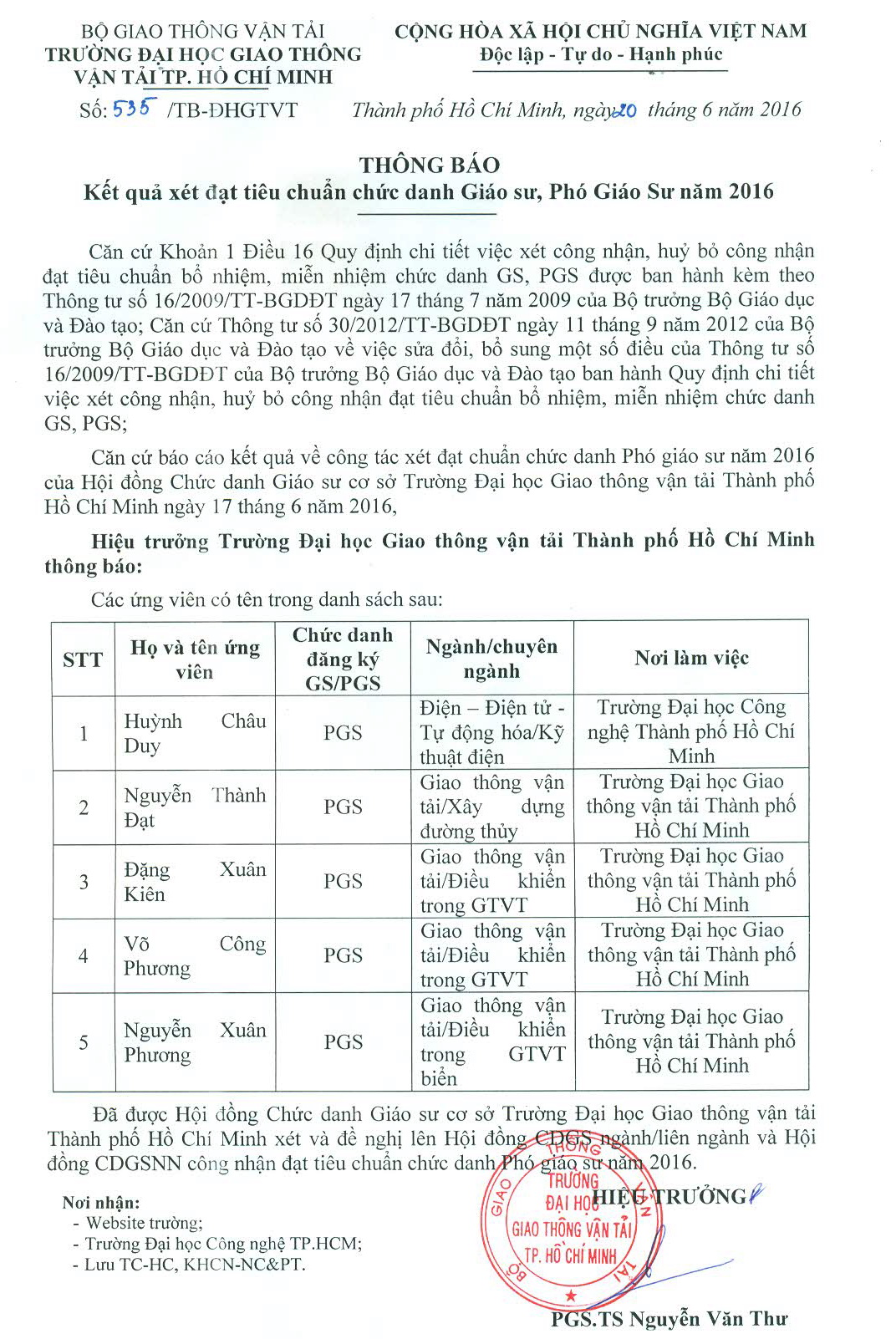 Thông báo Kết quả xét đạt tiêu chuẩn chức danh Giáo sư, Phó Giáo sư năm 2016 (Cập nhật ngày: 06/07/2016)