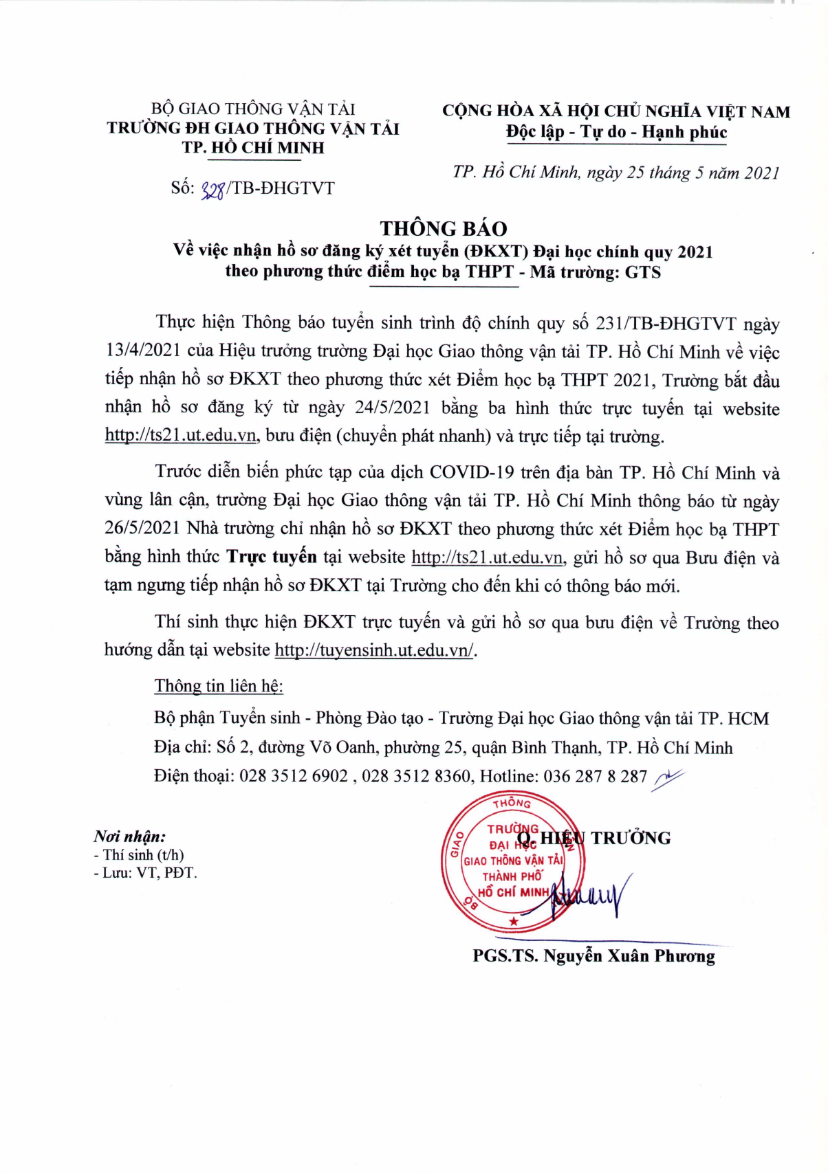 Thông báo nhận hồ sơ đăng ký xét tuyển đại học chính quy 2021 theo phương thức điểm học bạ THPT (Cập nhật ngày: 26/05/2021)