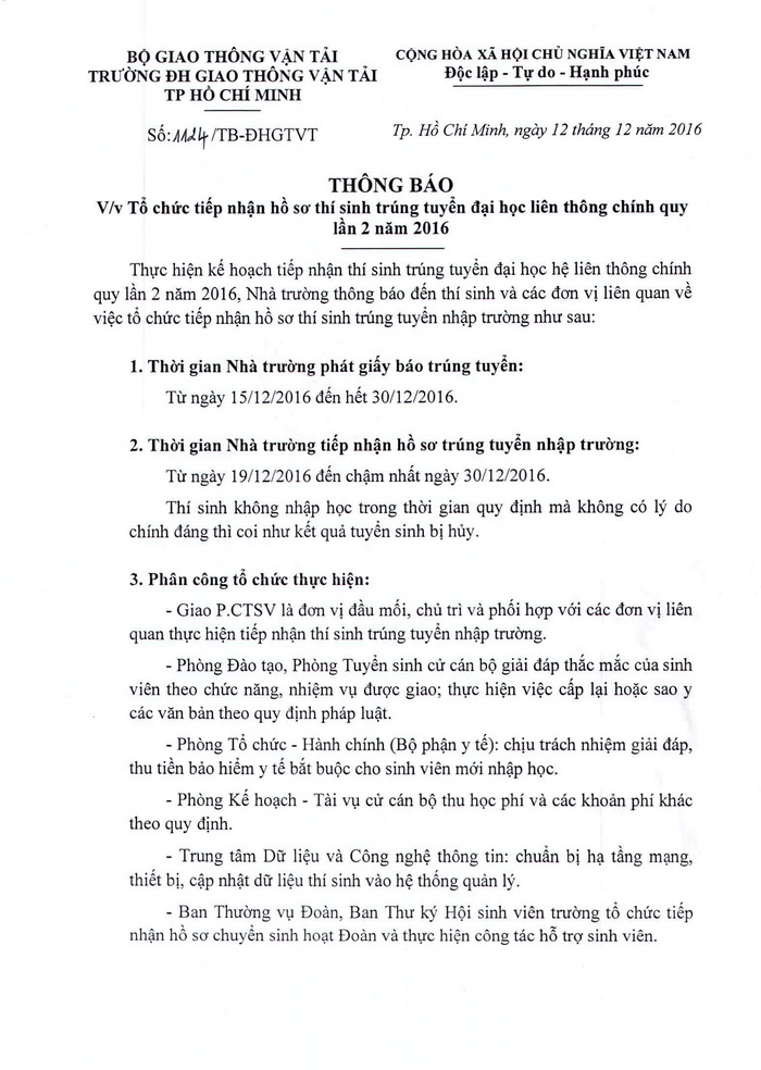 Thông báo tiếp nhận hồ sơ thí sinh trúng tuyển đại học liên thông chính quy lần 2 năm 2016 (Cập nhật ngày: 14/12/2016)