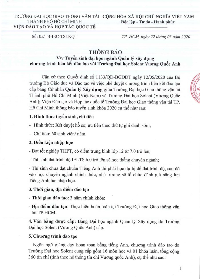 Thông báo tuyển sinh đại học ngành Quản lý xây dựng chương trình liên kết với Trường Đại học Solent (Vương quốc Anh) (Cập nhật ngày: 27/05/2020)