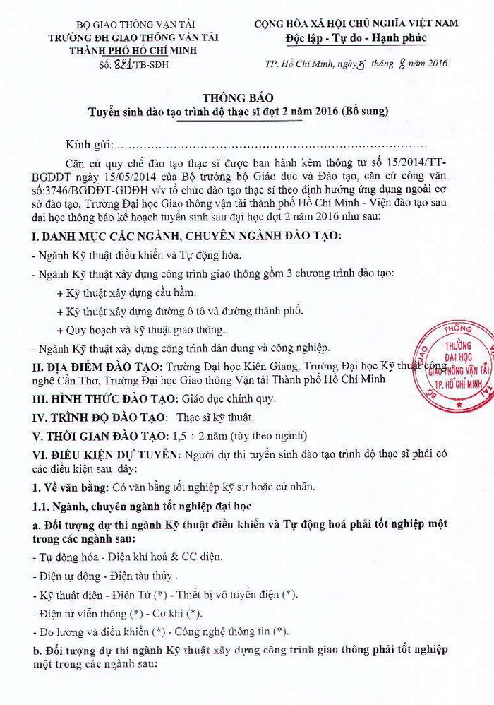 Trường ĐH Giao thông vận tải TP. HCM thông báo tuyển sinh Đại học, Cao đẳng chính quy năm 2016