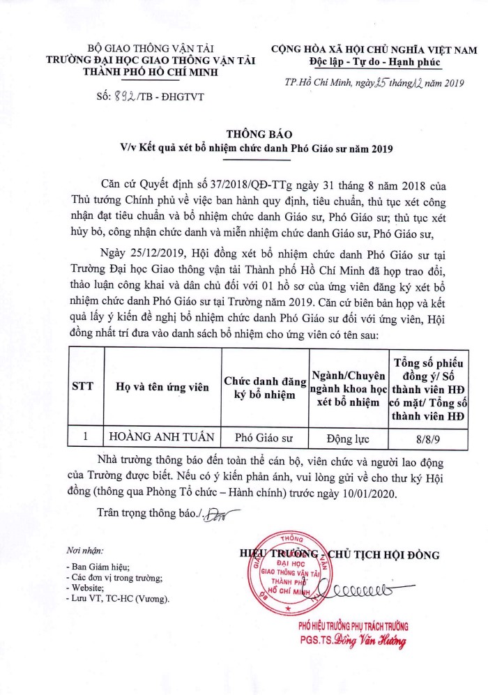 Thông báo về kết quả bổ nhiệm chức danh Phó Giáo sư năm 2019