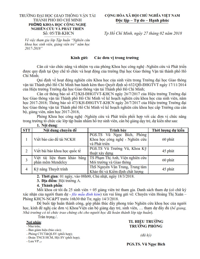 Thông báo về việc tham gia lớp Tập huấn "Nghiên cứu khoa học sinh viên, giảng viên trẻ năm học 2017-2018" (Cập nhật ngày: 27/02/2018)