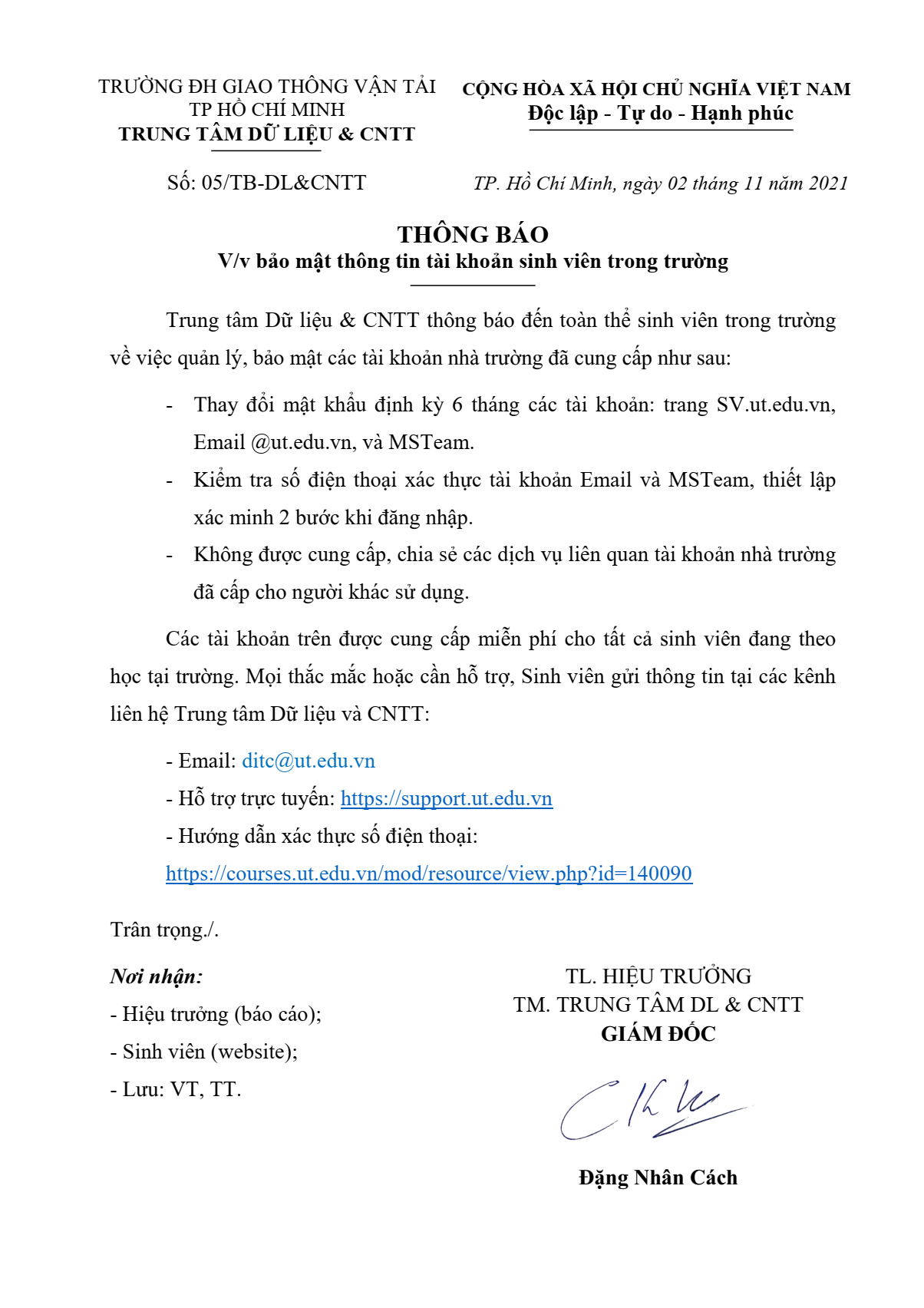 Thông báo V/v bảo mật thông tin tài khoản sinh viên trong trường