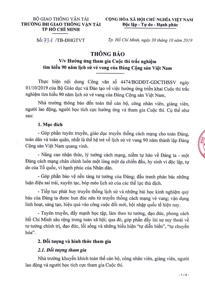 Thông báo V/v hưởng ứng tham gia Cuộc thi trắc nghiệm tìm hiểu 90 năm lịch sử vẻ vang của Đảng Cộng sản Việt Nam (Cập nhật ngày: 01/11/2019)