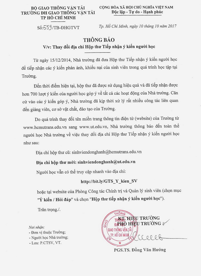 Thông báo V/v thay đổi địa chỉ hộp thư tiếp nhận ý kiến người học