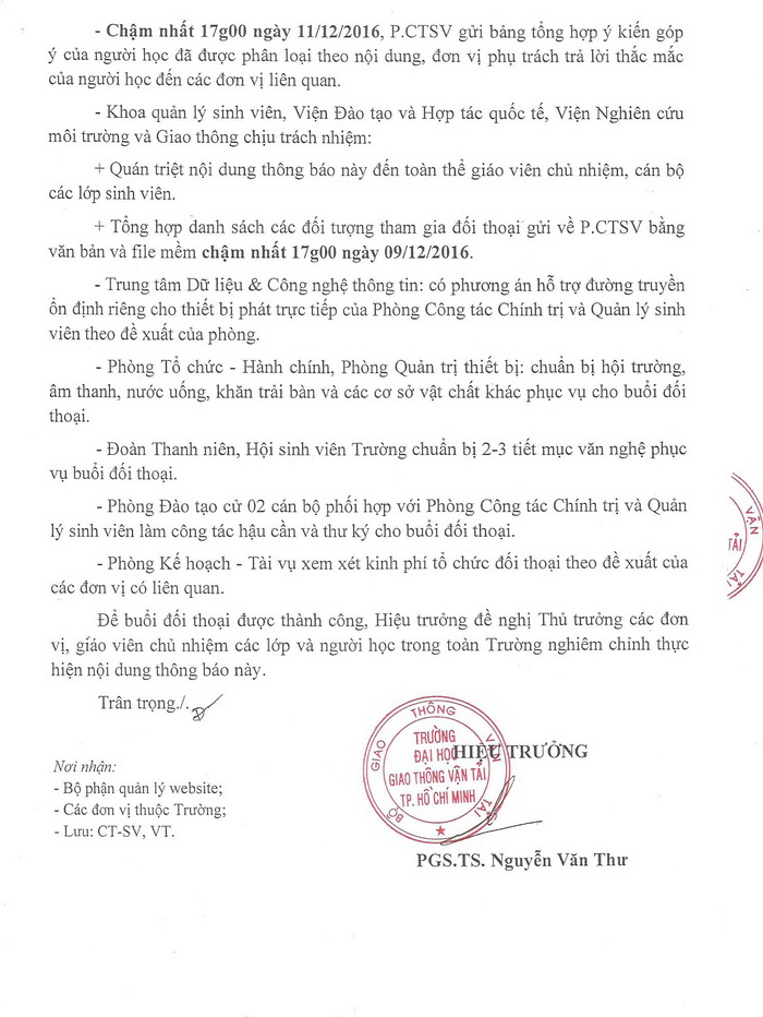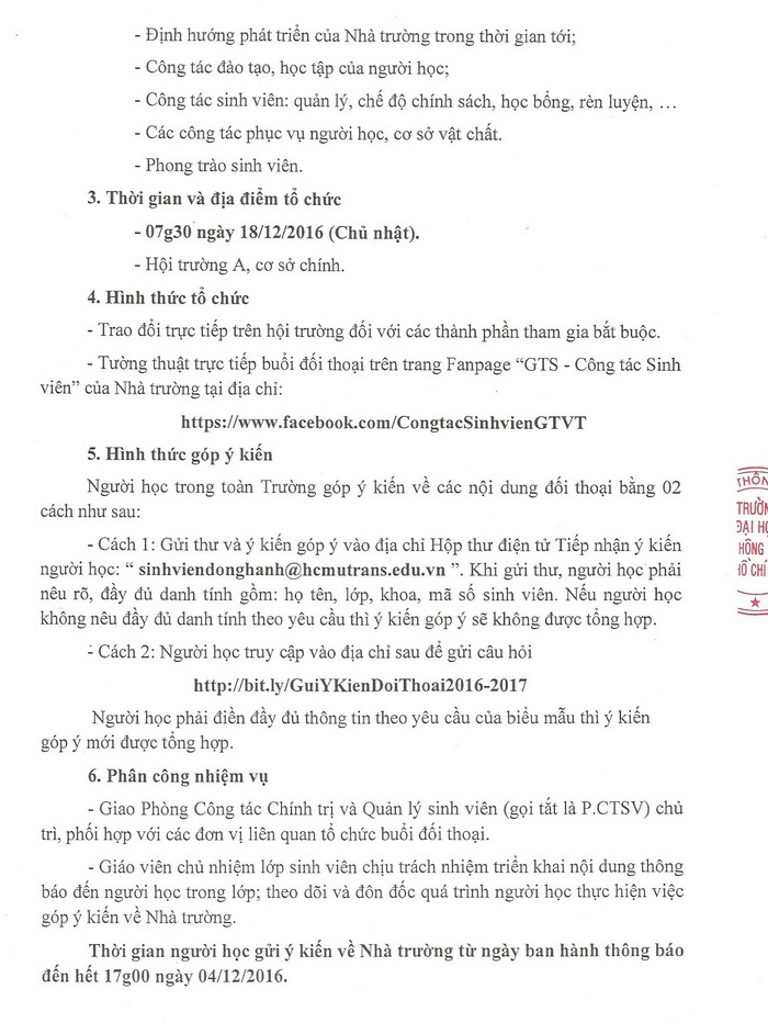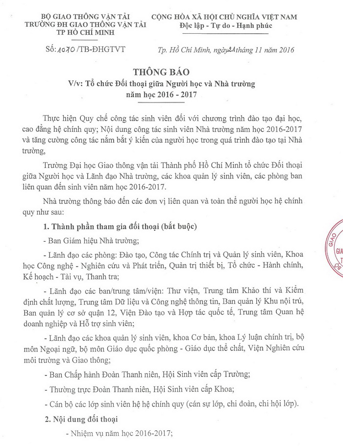 Thông báo V/v tổ chức đối thoại giữa người học và Nhà trường năm học 2016-2017 (Cập nhật ngày: 21/11/2016)