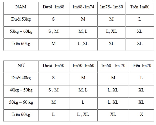 3. Bảng chiều cao, cân nặng tham khảo tương ứng với size áo: