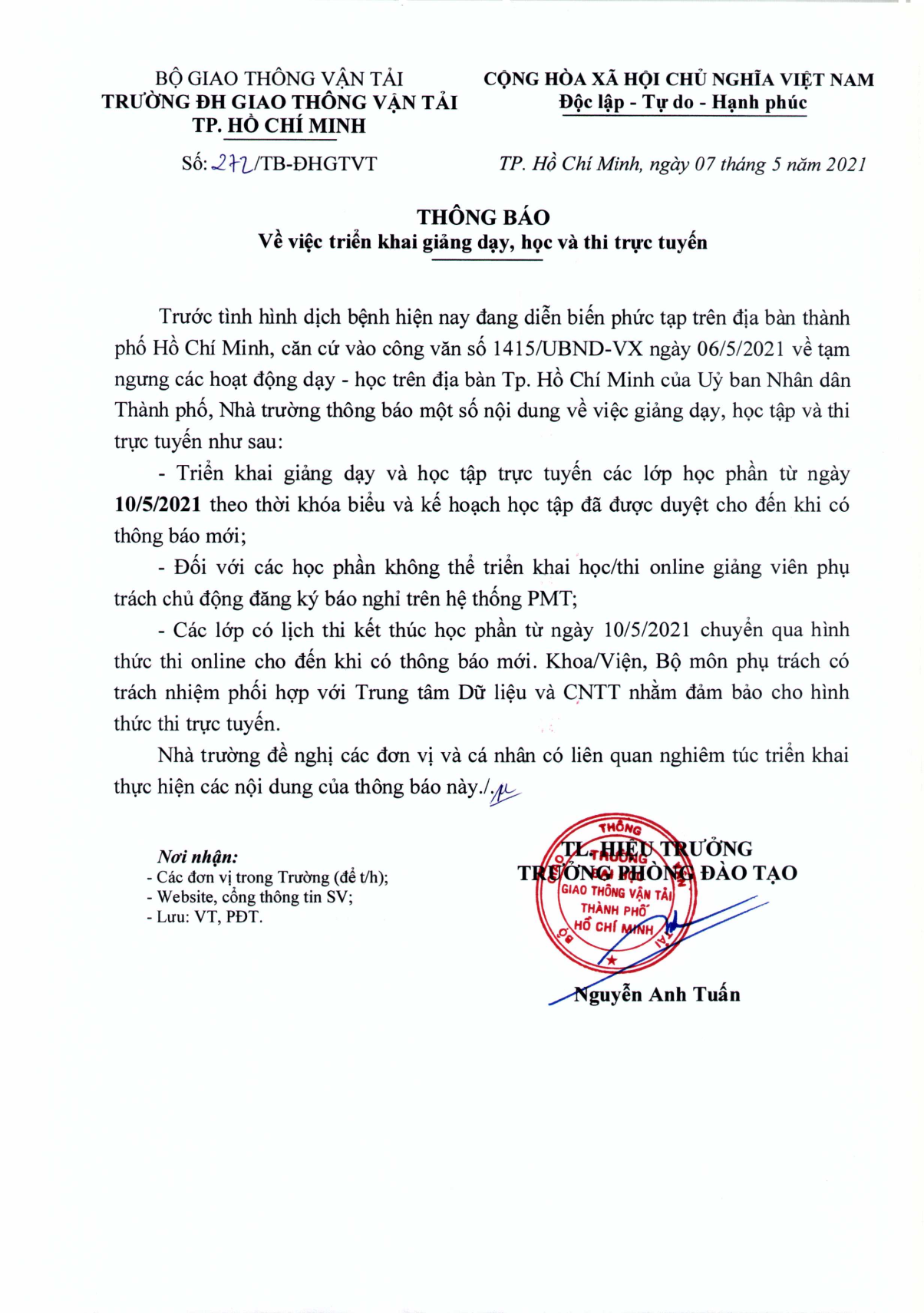 Thông báo V/v triển khai giảng dạy, học và thi trực tuyến