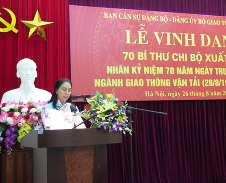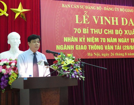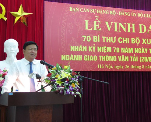 Bí thư Đảng ủy, Thứ trưởng Bộ GTVT Nguyễn Ngọc Đông cũng nhấn mạnh: Việc tổ chức vinh danh 70 bí thư chi bộ xuất sắc nhân dịp kỷ niệm 70 năm Ngày truyền thống ngành GTVT chính là sự cụ thể hóa sáng tạo trong việc thực hiện các chủ trương của Trung ương về tổ chức xây dựng Đảng, trong đó, việc thực hiện Chỉ thị số 10-CT/TW ngày 30/3/2007 của Ban Bí thư về nâng cao chất lượng sinh hoạt chi bộ và Nghị quyết 01-NQ/ĐUK của Ban Chấp hành Đảng bộ Khối về việc nâng cao chất lượng sinh hoạt chi bộ trong Đảng bộ Khối các cơ quan Trung ương gắn với việc triển khai Chỉ thị 03 CT/TW ngày 14/5/2011 của Bộ Chính trị về tiếp tục đẩy mạnh việc học tập và làm theo tấm gương đạo đức Hồ Chí Minh.