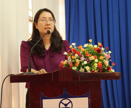 Đồng chí Uông Thị Lành báo cáo tổng kết năm học qua