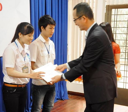 Đ/c Nguyễn Bá Hoàng, Phó Hiệu trưởng và ông Henry, Tổng Giám đốc Công ty SPCT trao học bổng cho các sinh viên