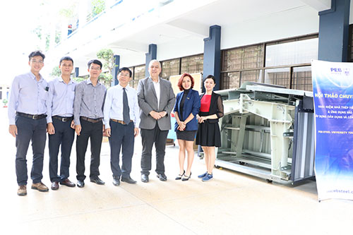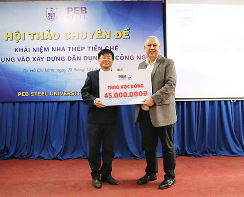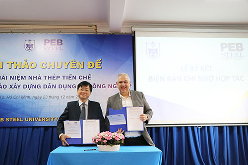 Ngày 24/12/2020, đại diện Công ty TNHH Nhà thép PEB đến thăm và làm việc tại Trường ĐH Giao thông vận tải TP.HCM. Tại buổi gặp mặt, PGS.TS Nguyễn Bá Hoàng, Phó Hiệu trưởng phụ trách Nhà trường đã cùng ông Adib Kouteilli, đồng sáng lập và Giám đốc điều hành Công ty TNHH Nhà thép PEB ký biên bản ghi nhớ hợp tác trong nghiên cứu và phát triển các mảng liên quan đến công nghệ, kỹ thuật xây dựng cầu đường có ứng dụng giải pháp cho nhà thép tiền chế….Ông Adib Kouteilli đã trao biểu trưng học bổng cũng như tặng Nhà trường mô hình nhà thép để giảng viên và sinh viên Trường nghiên cứu và thực hành.
