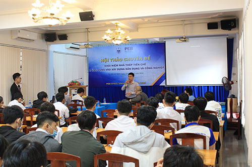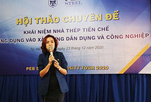 Bà Đinh Thị Tố Quyên, Trưởng phòng Truyền thông & Tiếp thị đã thuyết trình về “Ứng dụng của Nhà thép tiền chế và Kết cấu thép vào xây dựng dân dụng và công nghiệp”. Trong đó giới thiệu rất chi tiết về nhà thép tiền chế cũng như những ứng dụng trong thực tế.