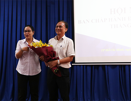 Đồng chí Nguyễn Thị Kim Thúy chúc mừng đồng chí Nguyễn Văn Thư hoàn thành tốt nhiệm vụ trong thời gian qua