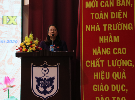 Phát biểu tại Đại hội, đồng chí Nguyễn Thị Kim Thuý, Bí thư Đảng ủy Khối cơ sở Bộ Giao thông vận tải đã biểu dương những thành tích mà Đảng bộ Trường đã đạt được trong nhiệm kỳ qua và lưu ý một số nội dung mà Đảng bộ trường cần đặc biệt quan tâm trong xu thế hiện nay. Đồng chí Nguyễn Thị Kim Thuý đề nghị mỗi đại biểu cần phát huy tinh thần trách nhiệm, vượt qua khó khăn thách thức để đạt được những mục tiêu đã đề ra. Đảng bộ Trường cần tiếp tục nâng cao năng lực lãnh đạo, sức chiến đấu của tổ chức cơ sở đảng và chất lượng đội ngũ cán bộ, đảng viên; nâng cao chất lượng sinh hoạt chi bộ và xây dựng tổ chức cơ sở đảng trong sạch, vững mạnh; tập trung vào việc củng cố, nâng cao chất lượng tổ chức Đảng, đổi mới nội dung, hình thức sinh hoạt Đảng, nâng cao vị trí, vai trò năng lực dự báo, tầm nhìn của đội ngũ cán bộ chủ chốt cấp ủy Đảng.