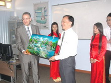 | PGS.TS.Trần Cảnh Vinh, Cố vấn Hiệu trưởng và đại diện đoàn trường Thái Lan trao quà lưu niệm |