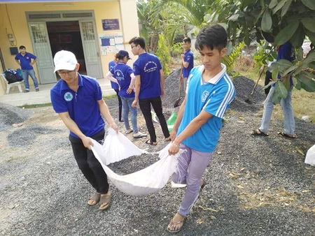 Đoàn viên sinh viên trường thực hiện bê tông hóa sân chơi thiếu nhi tại phường Tân Chánh Hiệp quận 12