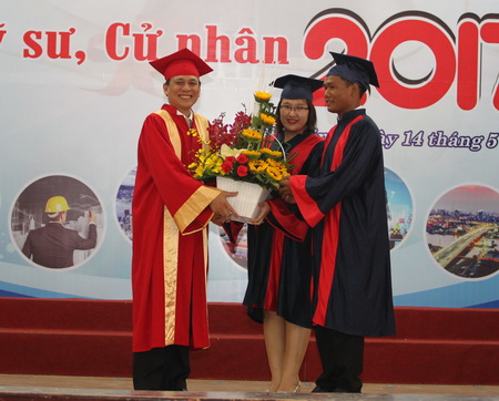Đại diện Nhà trường nhận bó hoa tươi thắm từ các phụ huynh và tân kỹ sư, cử nhân trao tặng