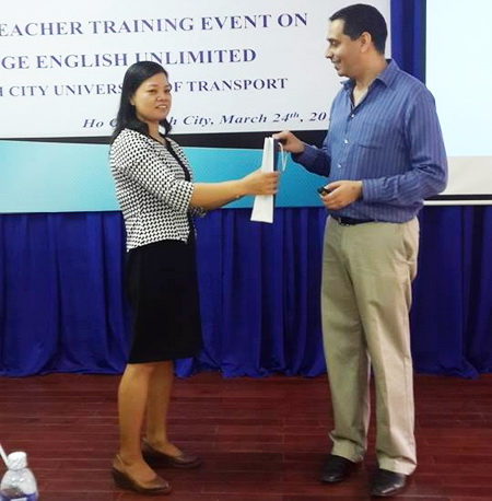 Chuyên gia đã giới thiệu cách khai thác bộ giáo trình Cambridge English Unlimited, 6 cấp độ theo khung tham chiếu Châu Âu một cách hiệu quả nhất. Bộ giáo trình với đầy đủ các phần mềm giảng dạy, video, phần tự học, bài tập đa dạng đã thu hút sự quan tâm của các giảng viên Tiếng Anh các trường tham dự.