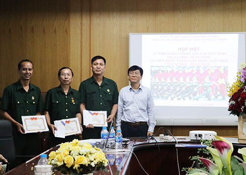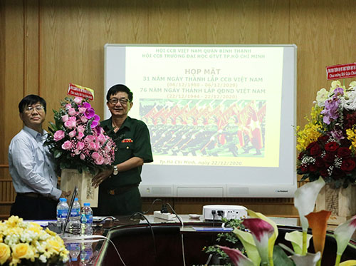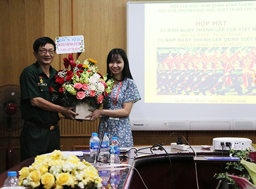 Đại diện Ban Giám hiệu, Công đoàn, Đoàn Thanh niên đã có mặt và tặng hoa chúc mừng Hội Cựu chiến binh trường. Đồng chí Lê Anh Hùng, Chủ tịch Hội Cựu chiến binh Trường đã ôn lại chặng đường phát triển của Quân đội nhân dân Việt Nam. Đồng thời, đồng chí cũng tổng kết công tác năm 2020 và tuyên dương các hội viên hoàn thành các nhiệm vụ chuyên môn, tập trung nghiên cứu và tuyên truyền lịch sử vẻ vang của Đảng Cộng sản Việt Nam...