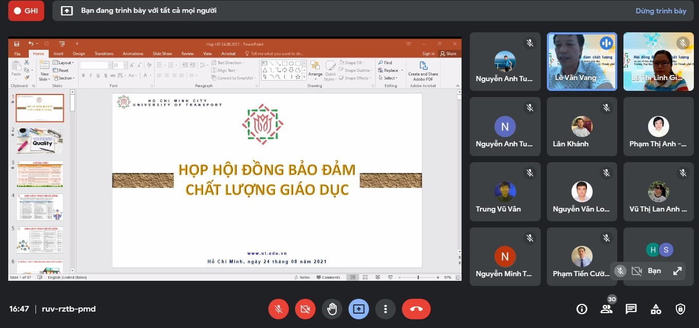 Tại phiên họp, đại diện phòng Quản lý chất lượng đã báo cáo dự thảo các văn bản gồm: Kế hoạch bảo đảm chất lượng giai đoạn 2021-2025, Quy định tổ chức và hoạt động của Hội đồng bảo đảm chất lượng, Quy định bảo đảm chất lượng và quy định bảo đảm chất lượng công tác kiểm tra, đánh giá kết quả học tập của người học để lấy ý kiến góp ý của các thành viên Hội đồng. Các thành viên Hội đồng đã cùng nhau thảo luận và biểu quyết thông qua các nội dung các văn bản và giao phòng Quản lý chất lượng tiếp tục hoàn chỉnh và trình ký ban hành.
