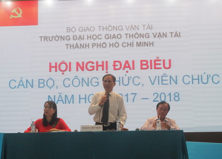 Hội nghị đã nghe PGS.TS. Đồng Văn Hướng, Phó Hiệu trưởng nhà trường báo cáo kết quả thực hiện Nghị Quyết Đại hội cán bộ, công chức viên chức năm học 2016-2017 và phương hướng năm học 2017-2018 trong công tác đào tạo; công tác quản lý sinh viên; công tác tổ chức cán bộ; công tác nghiên cứu khoa học và hợp tác quốc tế; công tác tài chính, cơ sở vật chất và một số hoạt động khác.