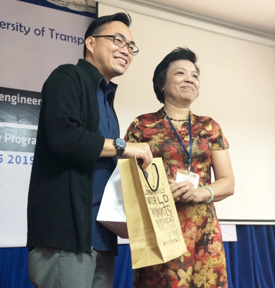 Tại buổi gặp gỡ giao lưu, PGS.TS Phạm Thị Anh, đại diện Trường Đại học Giao thông vận tải TP. Hồ Chí Minh trao quà cho đại diện phía Trường Đại học công nghệ và thiết kế Singapore và gửi lời cảm ơn sâu sắc đến trường bạn đã chia sẻ kinh nghiệm trong việc tích hợp các yếu tố cộng đồng vào chương trình đào tạo kỹ thuật cho Trường Đại học Giao thông vận tải TP. Hồ Chí Minh.