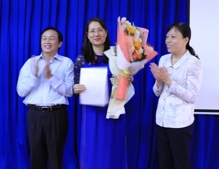 Đại diện Liên đoàn Lao động TP. HCM và Nhà trường chúc mừng tân Chủ tịch Công đoàn Trường