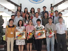 | Đại diện nhà trường nhận những bó hoa tươi thắm thay lời cảm ơn từ phụ huynh và sinh viên |