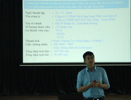 Sinh viên được đại diện Công ty Cổ phần Tân Cảng Sóng Thần giới thiệu tổng quan về công ty, các kho hàng cũng như các hoạt động logistics tại đây.
