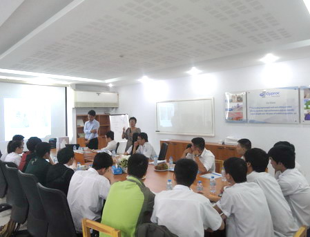 Tại SGV, sinh viên đã được Công ty chia sẻ những vấn đề lý thuyết về thạch cao và công nghệ sản xuất của SGV. Nối tiếp chương trình, sinh viên đã cùng nhân viên kĩ thuật của SGV tham quan trực tiếp dây chuyền sản xuất thạch cao trong nhà máy.