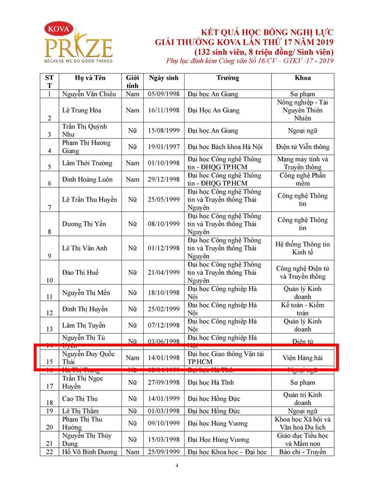 Sinh viên Nguyễn Duy Quốc Thái là 1 trong 3 sinh viên có hồ sơ được Nhà trường gửi đi tham dự giải và là 1 trong 132 sinh viên cả nước vinh dự đạt giải thưởng Kova năm 2019. Sinh viên Thái là một sinh viên năng động, tư duy tích cực, cầu tiến, Nguyễn Duy Quốc Thái đã không ngừng tìm tòi, học hỏi, nghiên cứu và đã đạt được thành tích cao trong quá trình học tập tại Trường trong suốt những năm vừa qua.