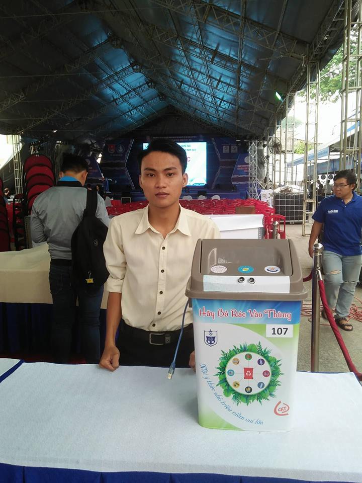 Hoạt động dựa trên nguyên lí cảm ứng: Khi bạn đưa rác vào, nắp thùng sẽ tự động mở và phát lên âm thanh "xin chào các bạn”. Sau khi bỏ rác xong bạn sẽ nhận được một lời cảm ơn dễ thương “Cảm ơn các bạn, chúc các bạn một ngày tốt lành!". Bên cạnh đó, khi những thùng rác đầy nó sẽ tự động báo về máy chủ để dễ dàng quản lí và xử lí rác thải. Những ưu điểm mà sản phẩm mang lại: Tiết kiệm được chi phí và nhân công trong việc thu gom, xử lí rác, thân thiện và dễ sử dụng với mọi người, nâng cao ý thức người dân, bảo vệ môi trường.