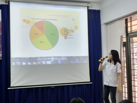 Sinh viên thuyết trình báo cáo nghiên cứu thị trường trong phần làm việc nhóm